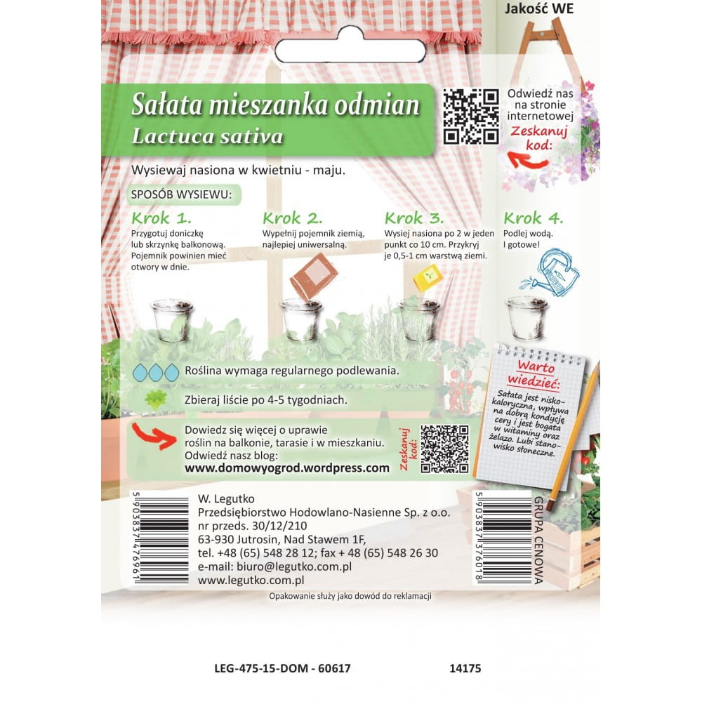 Sałata jest niskokaloryczna, wpływa na dobrą kondycję cery i jest bogata w witaminy oraz żelazo. Lubi stanowisko słoneczne. Wysiewaj nasiona od kwietnia do czerwca. Zbieraj liście po 4-5 tygodniach.