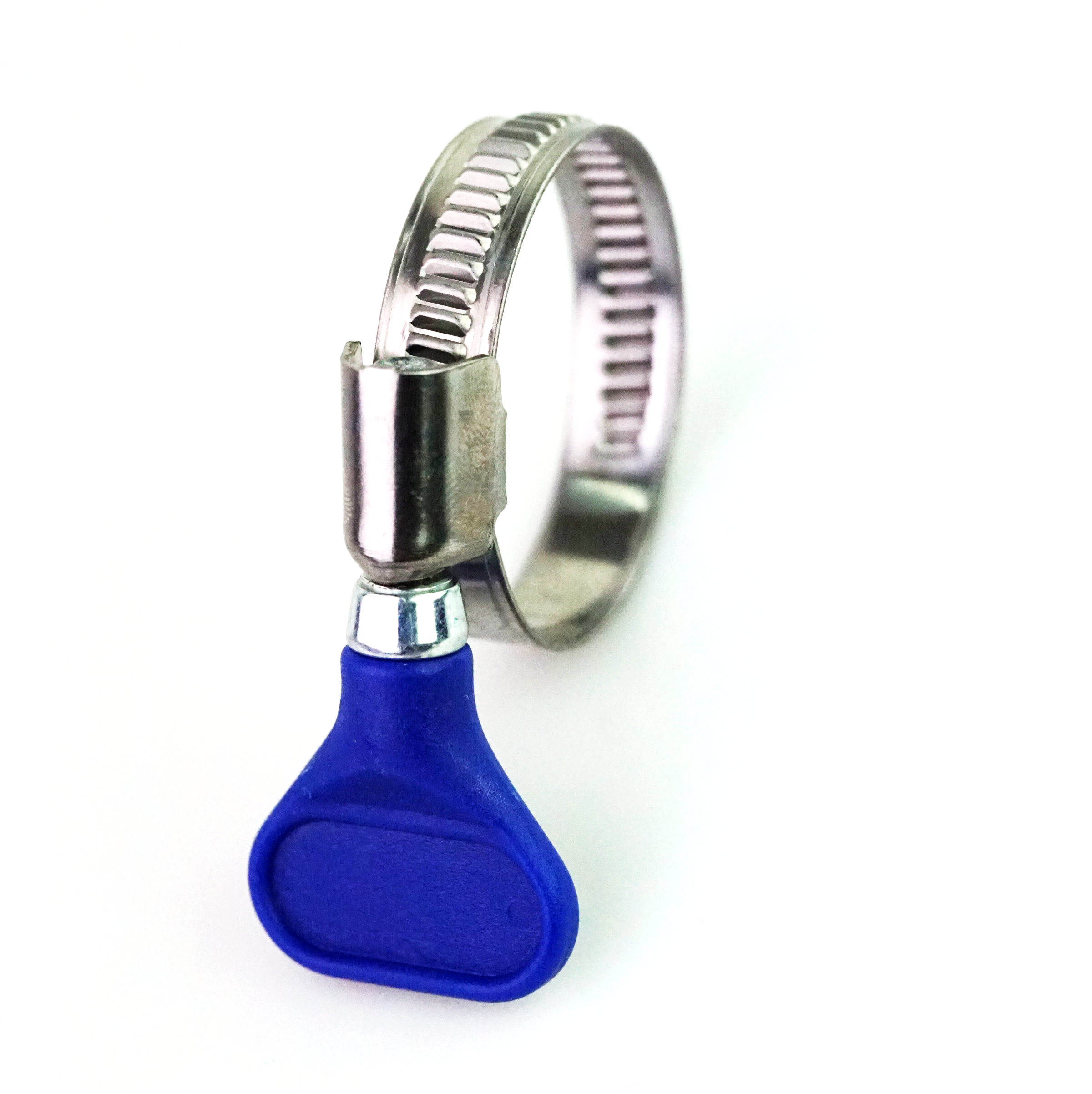 - Reduktor umieść szerszą końcówką w gumowym elemencie. Na węższą końcówkę reduktora załóż wąż od beczki i zaciśnij metalową opaską zaciskową.